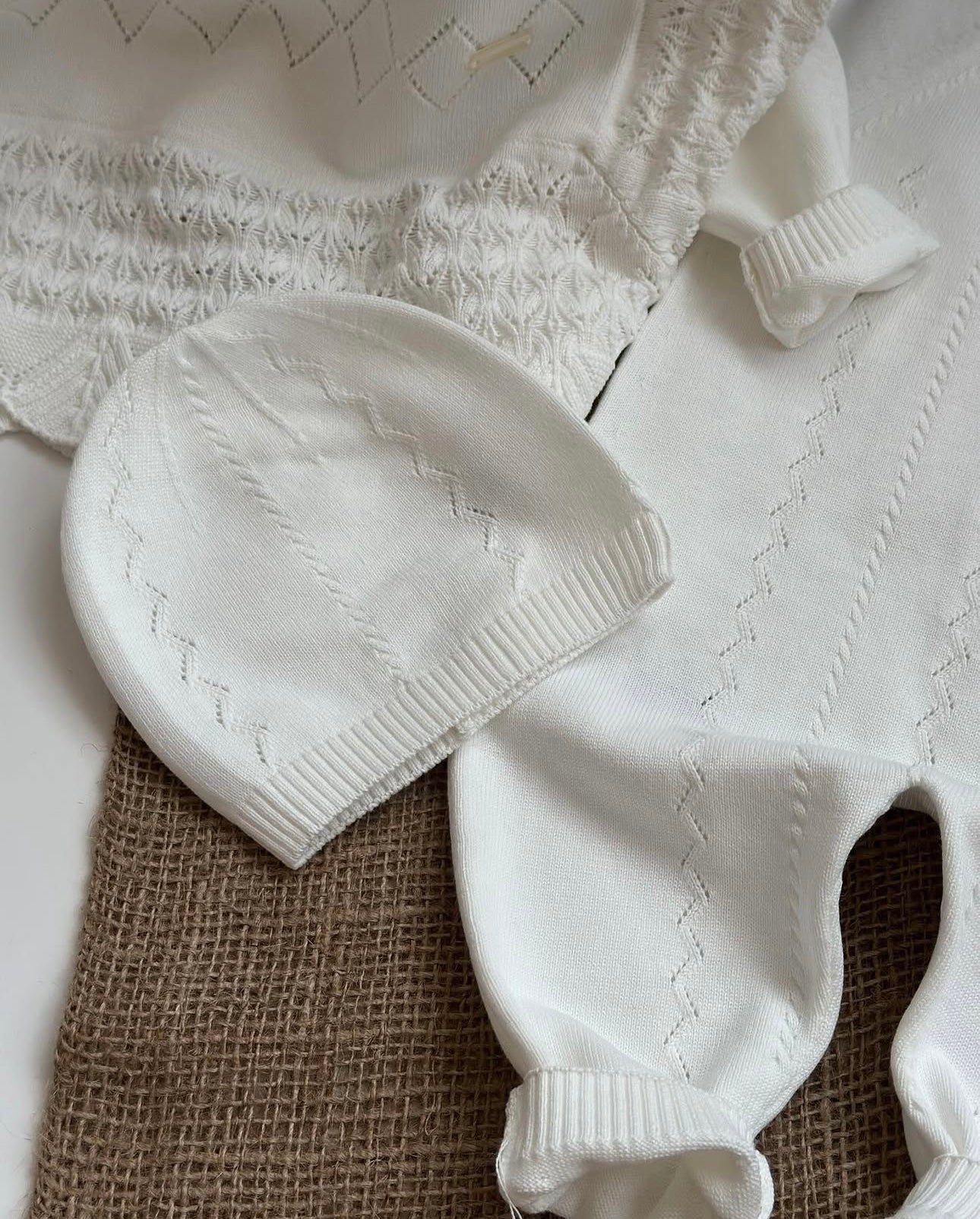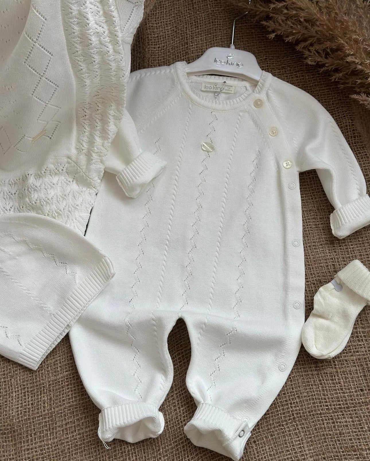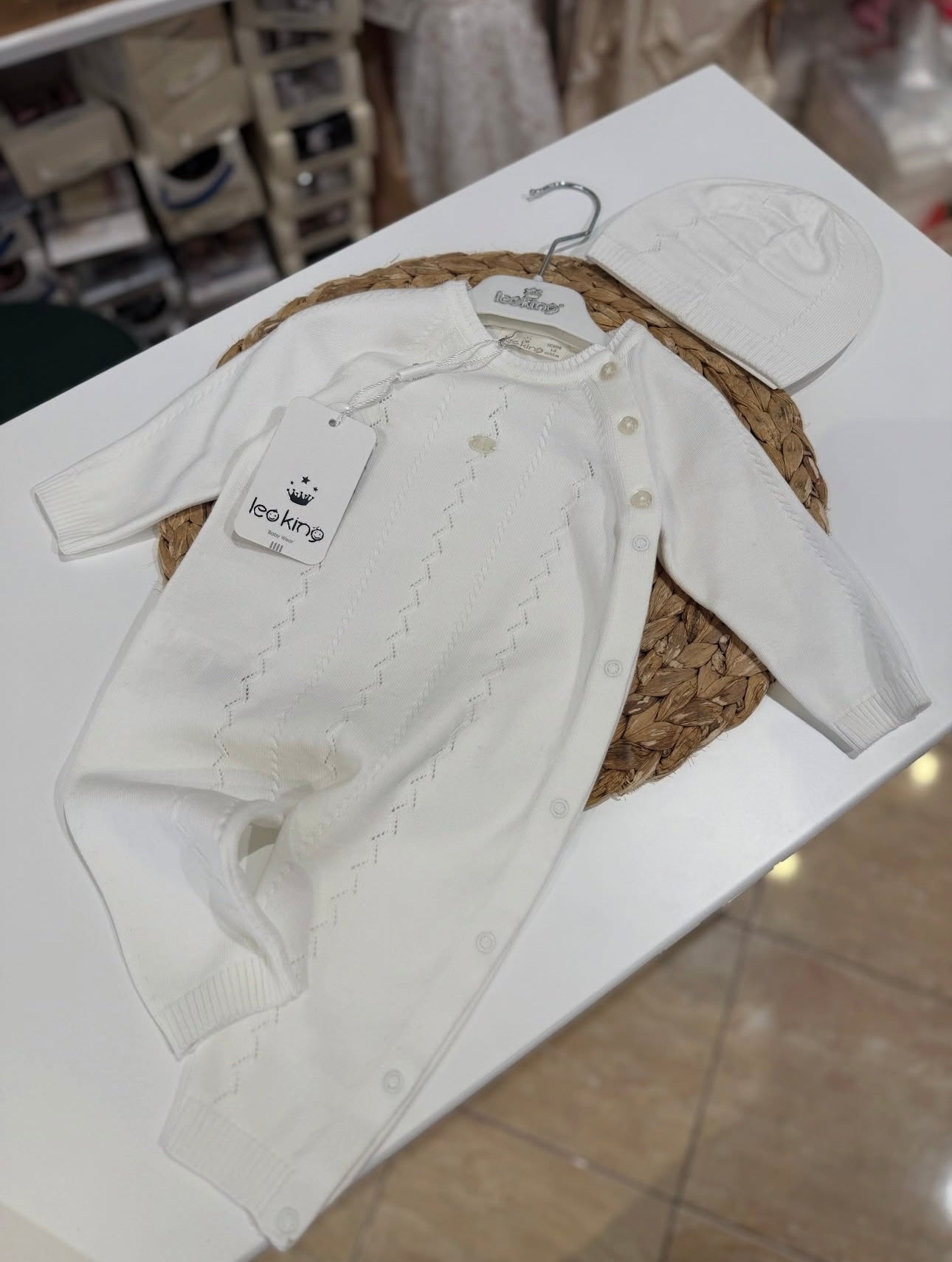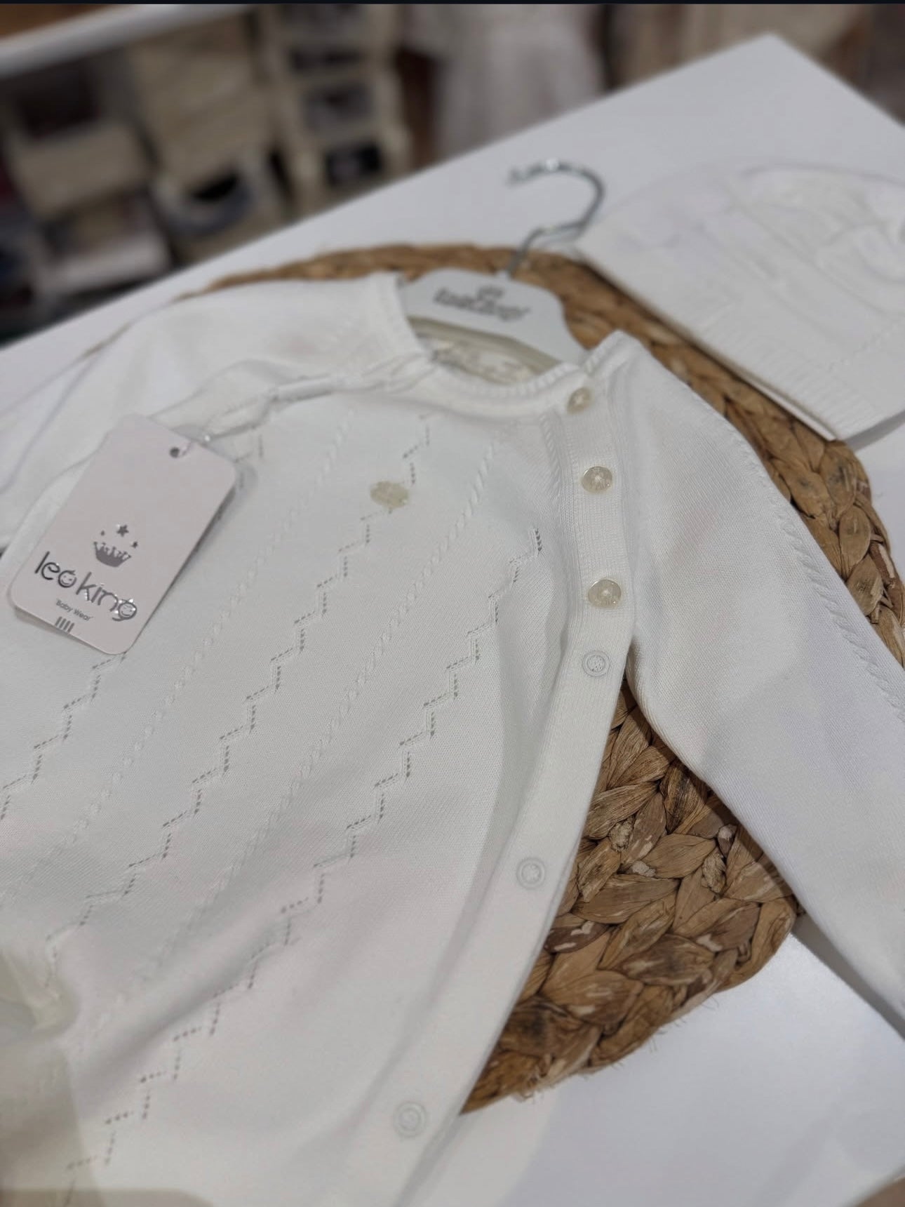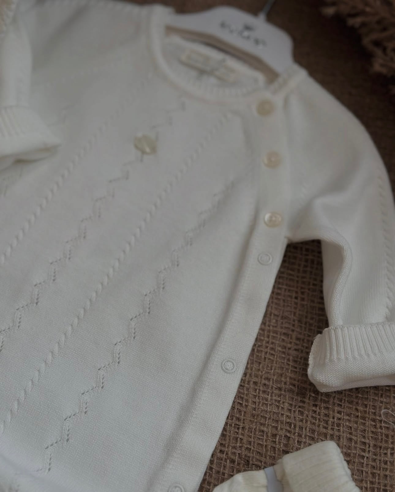 Avvolgi il tuo piccolo nel comfort e nell’eleganza con questa deliziosa tutina in maglia, realizzata in morbido cotone beige e bianco. Il design presenta un motivo a maglia decorativa a treccia sottile lungo la parte frontale, che dona un tocco raffinato e senza tempo.