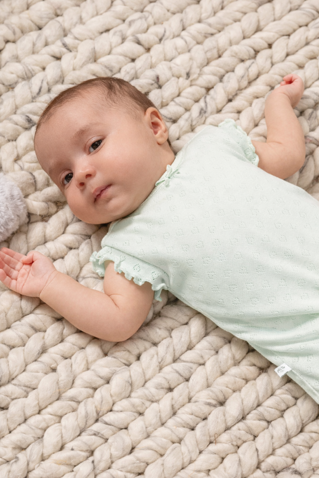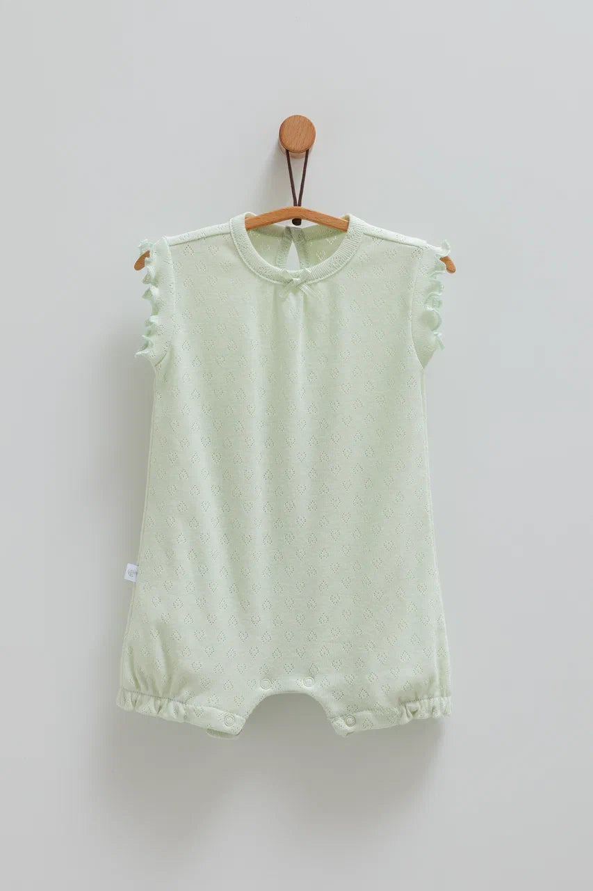 Envuelve a tu pequeñín con la máxima comodidad con este mono sin mangas, confeccionado en algodón suave y transpirable. Perfecto para los días cálidos, ofrece libertad de movimiento y un toque de elegancia gracias a los detalles perforados y los volantes en los hombros.