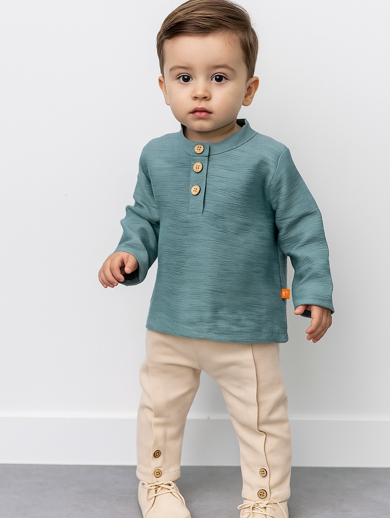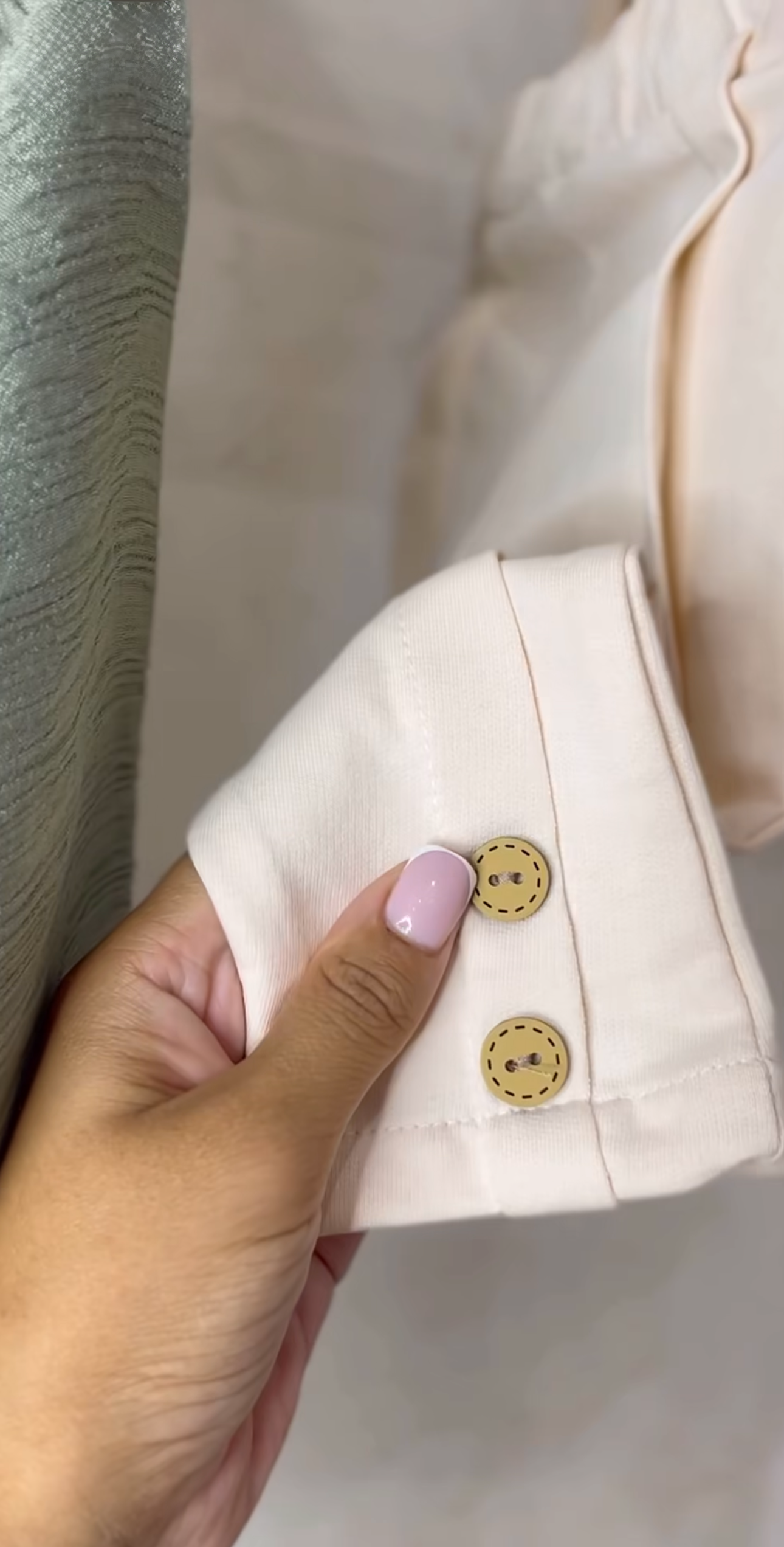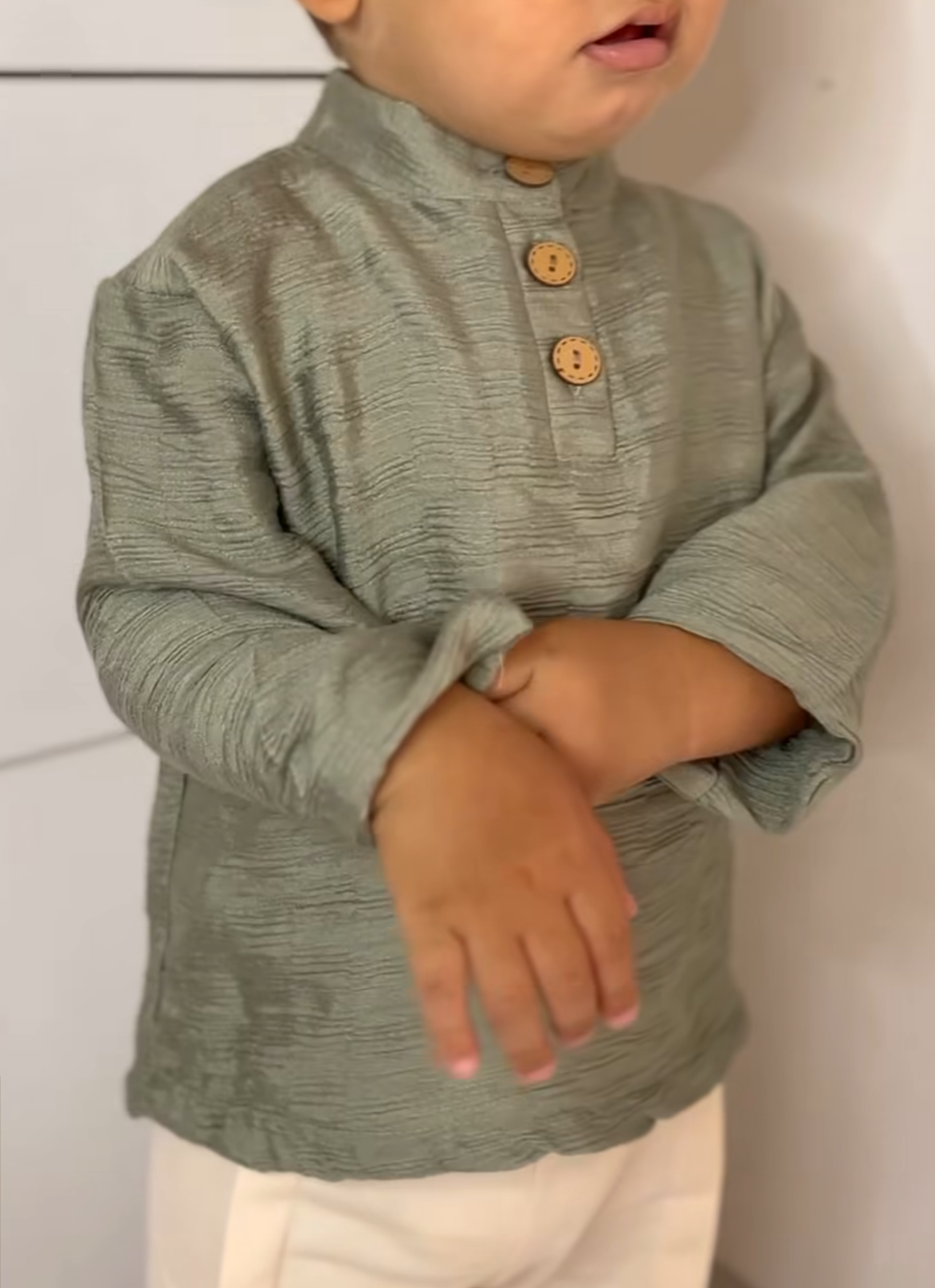 •Maglia verde oliva con collo alla coreana, maniche lunghe e apertura frontale con tre bottoni in legno.