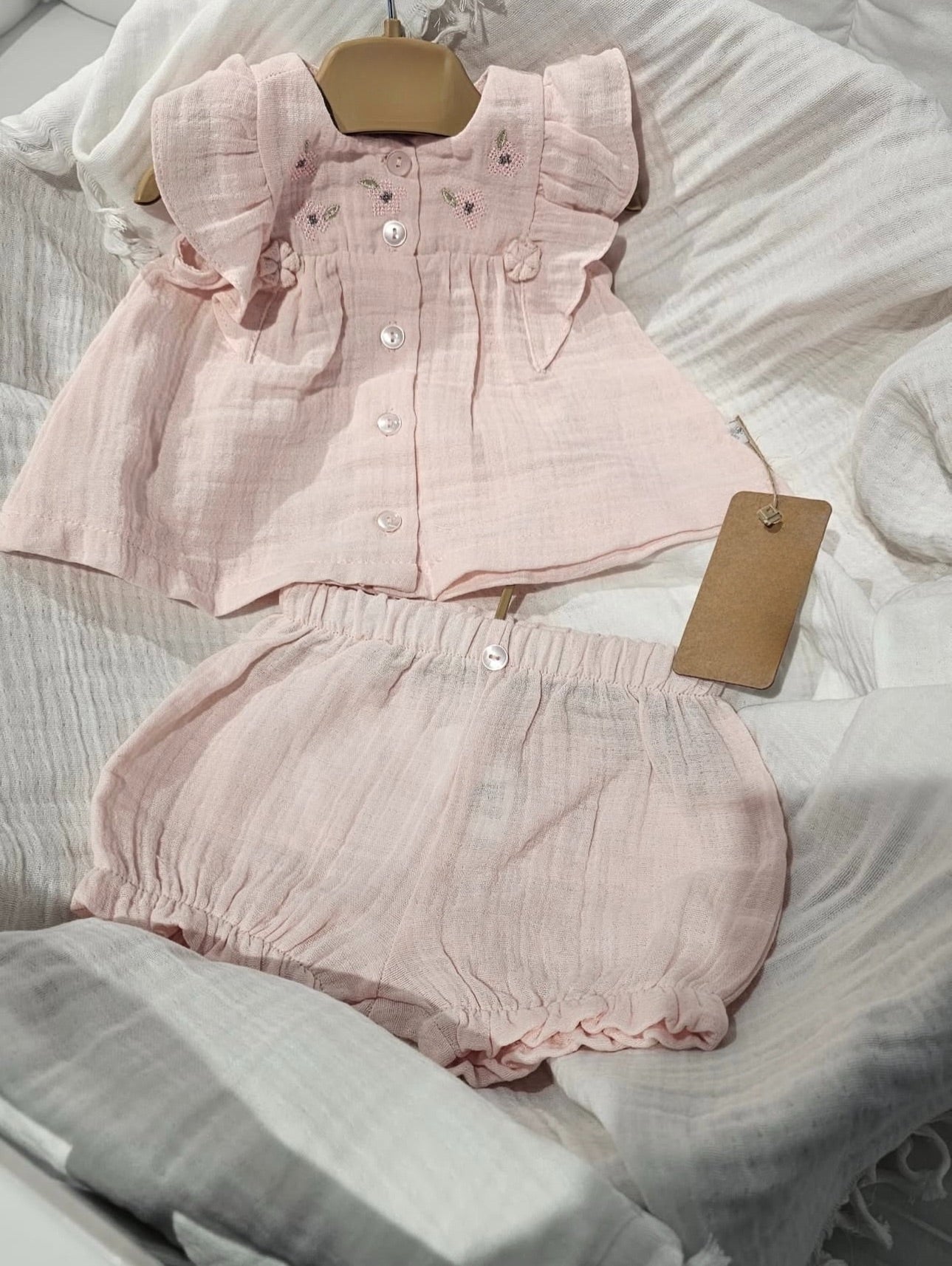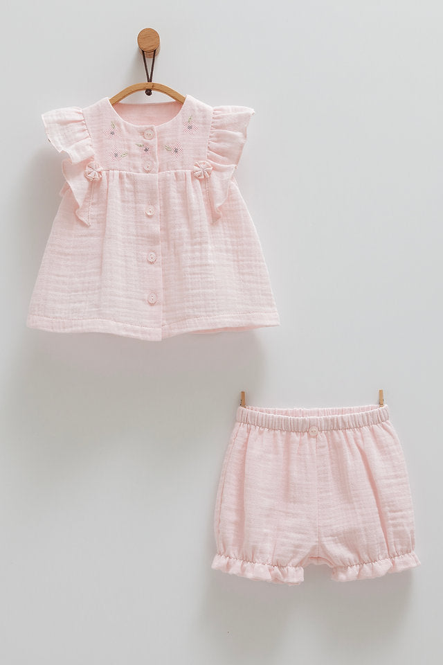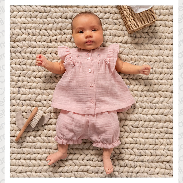 Un completo elegante e fresco, perfetto per le giornate estive! Questo set in mussola di cotone è composto da una blusa con volant sulle spalle e dettagli con fiocchetti e da shorts coordinati con elastico in vita, per un look raffinato e comodo. Il tessuto leggero assicura massima traspirabilità e morbidezza sulla pelle delicata del neonato.