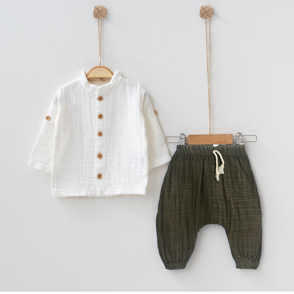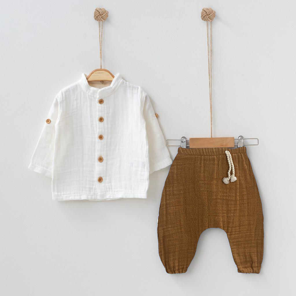 Questo raffinato set per bambino è composto da una camicia in mussola di cotone bianca con bottoni in legno e pantaloni morbidi con coulisse regolabile. Un look minimalista e naturale, perfetto per la pelle delicata dei più piccoli.