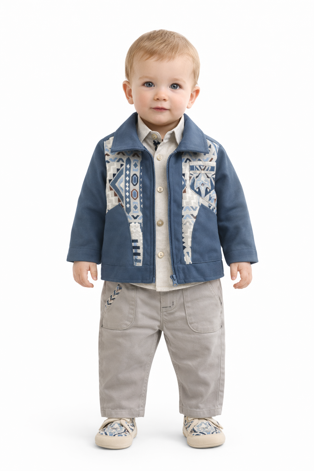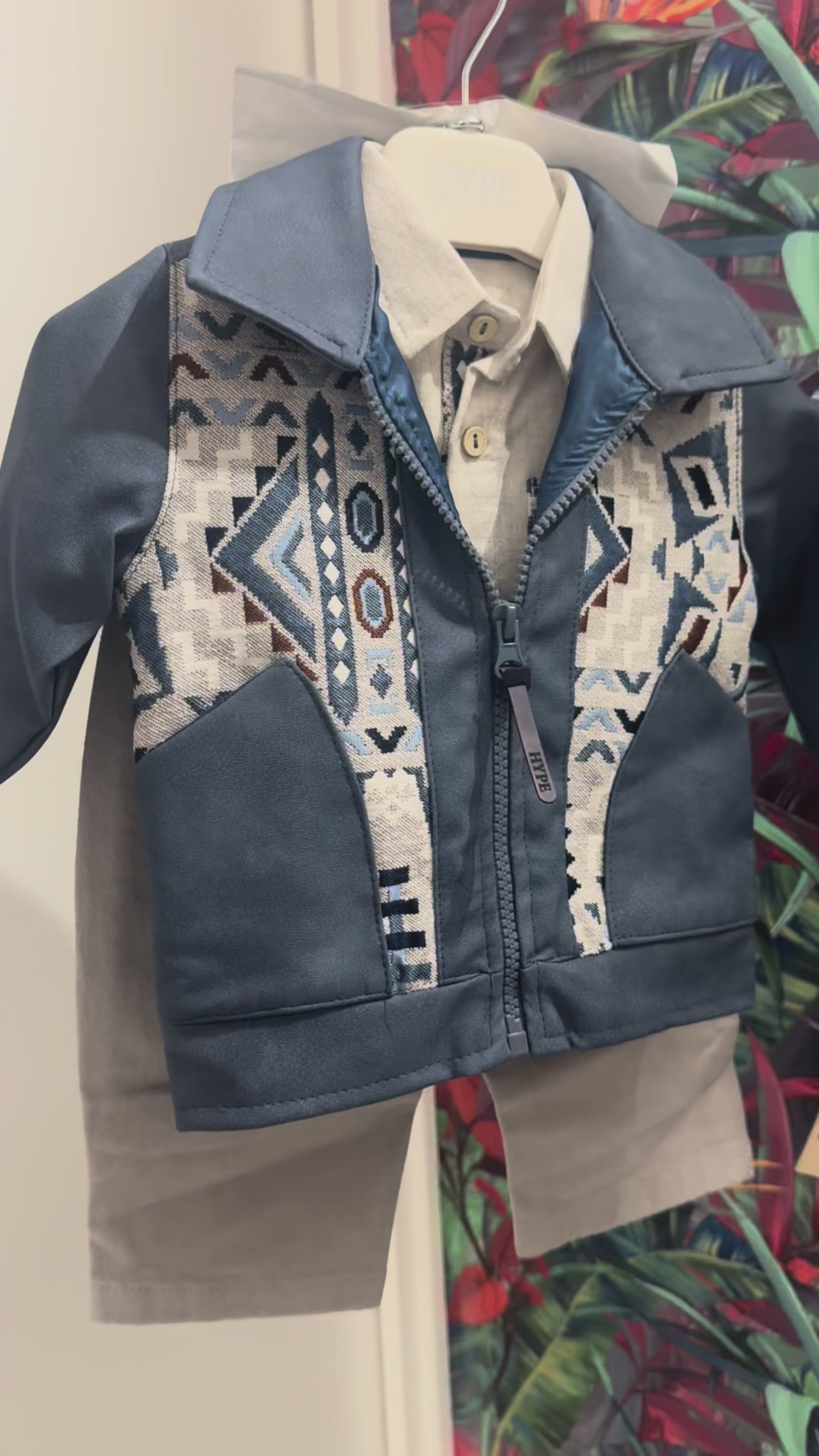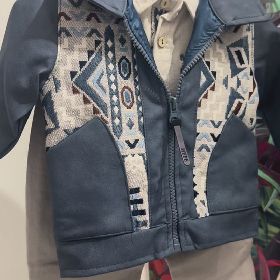 - Giacca in similpelle blu con zip e inserti geometrici decorativi
