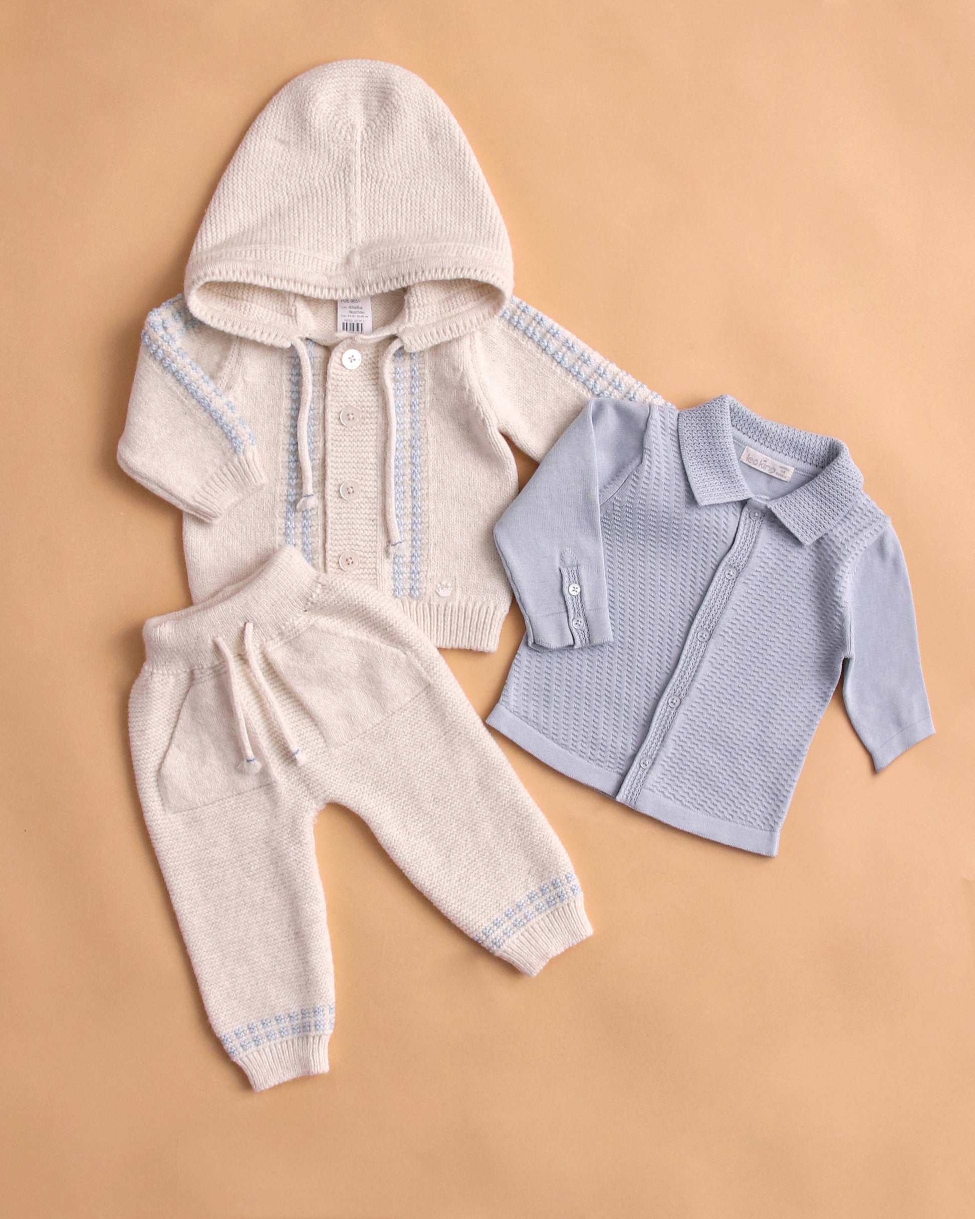 Questo elegante set neonato è composto da tre capi coordinati in tonalità delicate e raffinate: bianco e azzurro polvere. I tessuti morbidi e le lavorazioni a maglia rendono ogni pezzo confortevole, caldo e ideale per la pelle sensibile dei più piccoli.