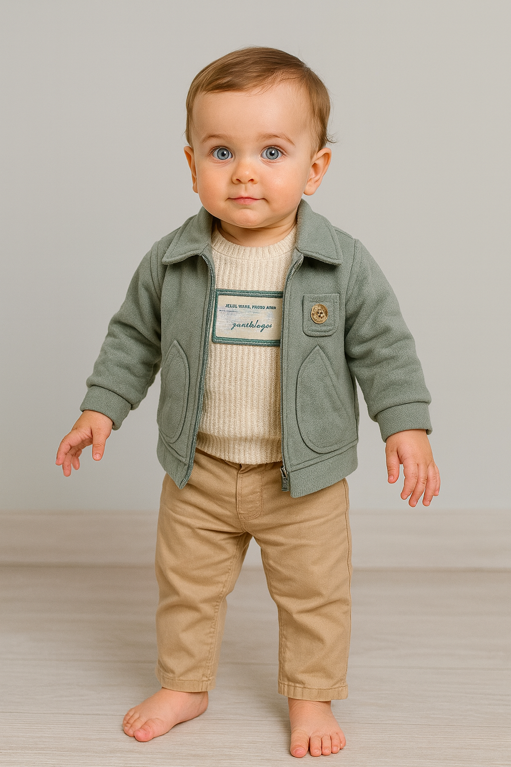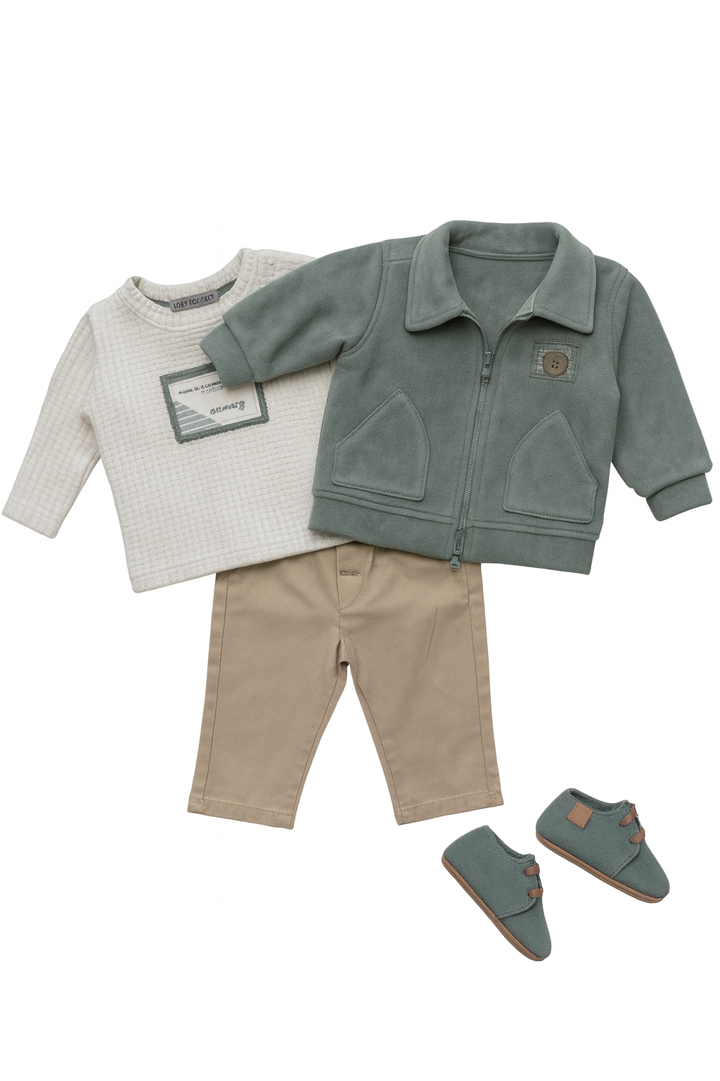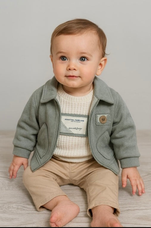 - Giacca con zip frontale in tessuto caldo tipo felpa/fleece, color verde salvia.