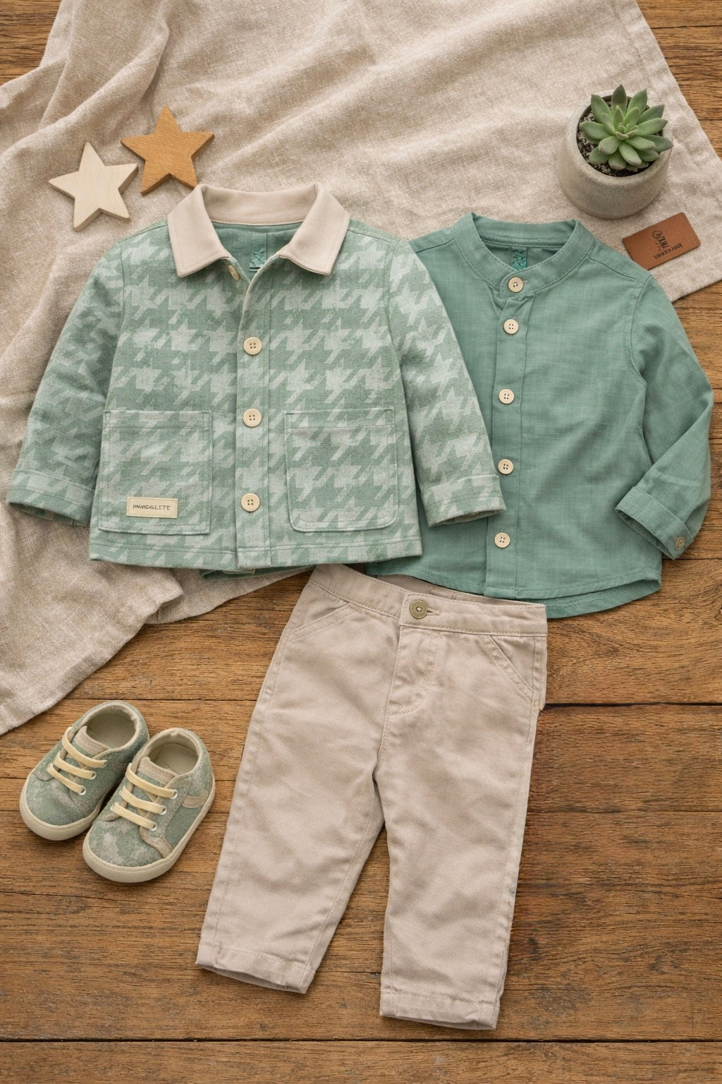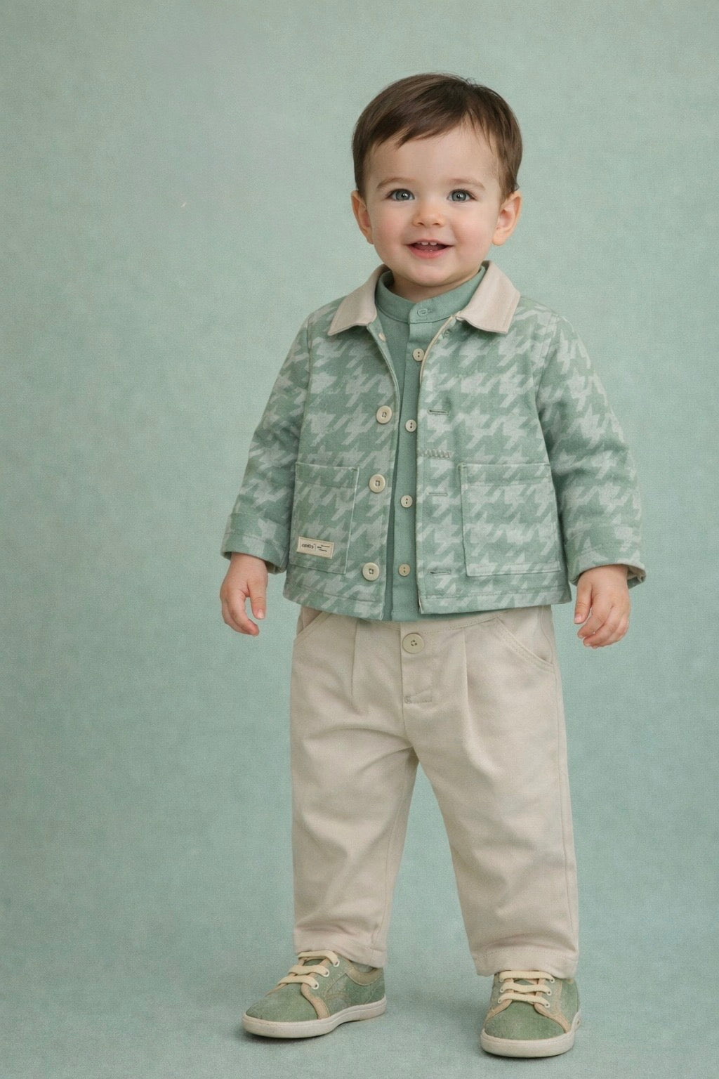 Completo neonato 4 pezzi composto da giacca in tessuto fantasia pied-de-poule verde, camicia in tinta coordinata, pantaloni beige e scarpette coordinate.