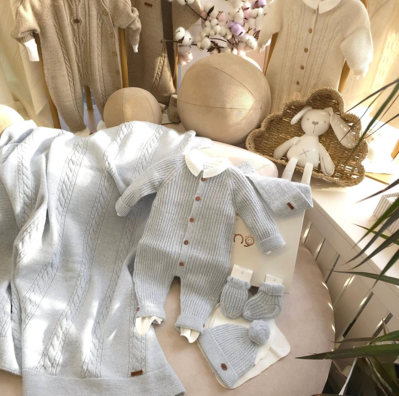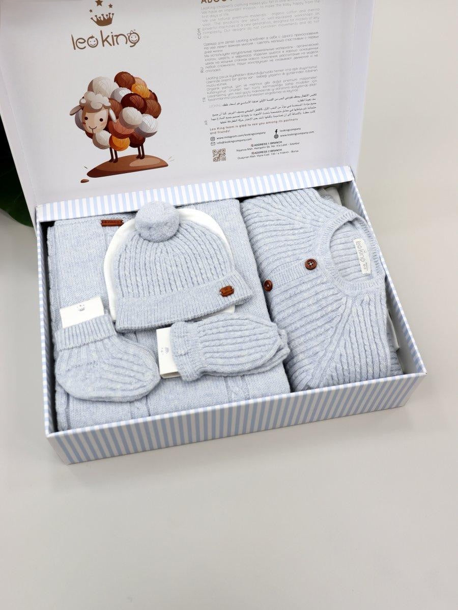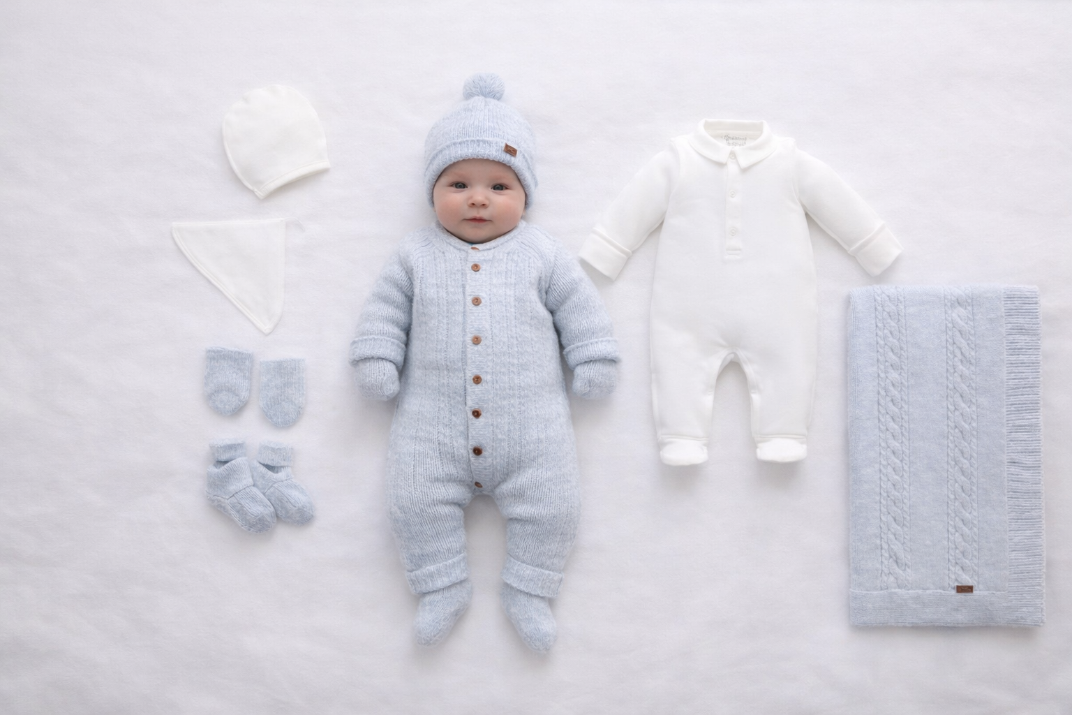 Elegante corredino nascita completo in delicata tonalità azzurro polvere, ideale per i primi mesi del neonato e perfetto come regalo nascita raffinato.