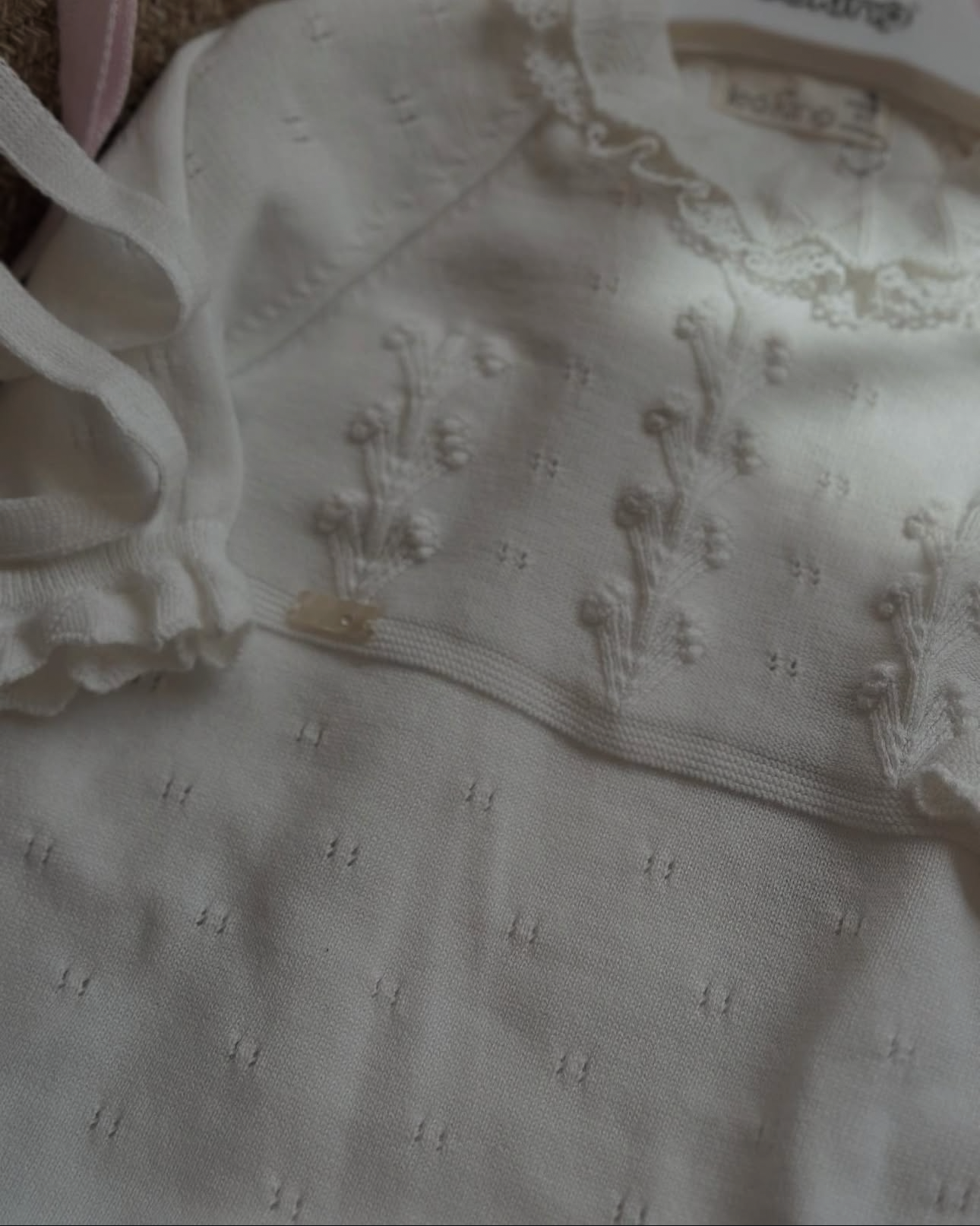 Un capo elegante e delicato, perfetto per il corredino del tuo neonato. Questo set include una tutina in maglia lavorata e una cuffietta abbinata, entrambe impreziosite da dettagli in pizzo e finiture romantiche. Il tessuto morbido e traspirante assicura il massimo comfort per la pelle delicata del bambino, mentre la chiusura laterale con bottoni facilita il cambio.