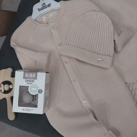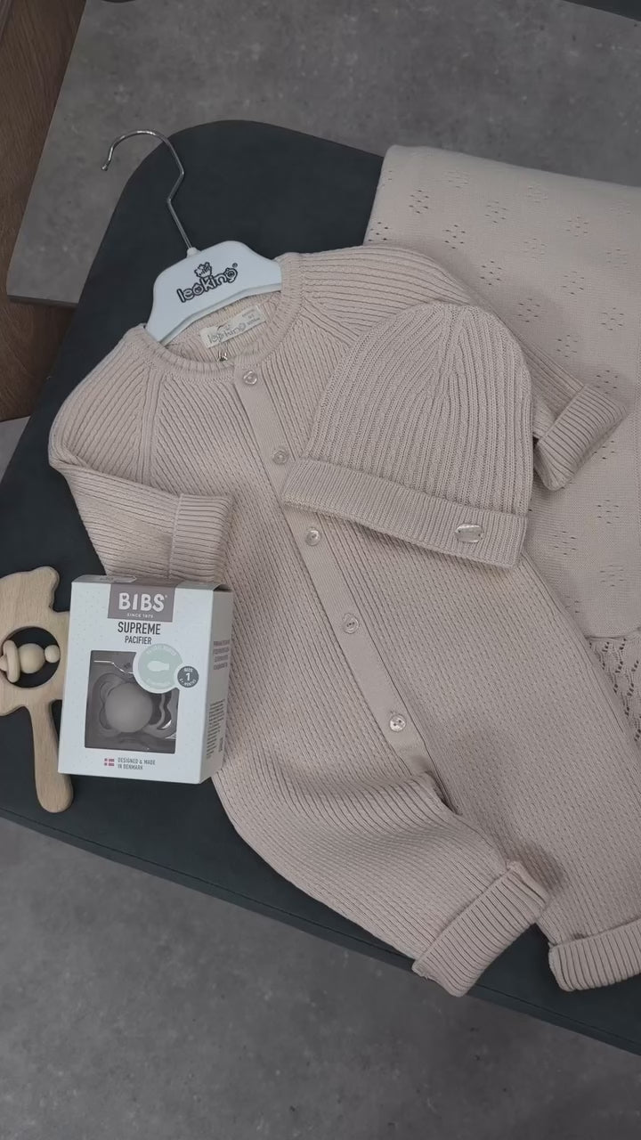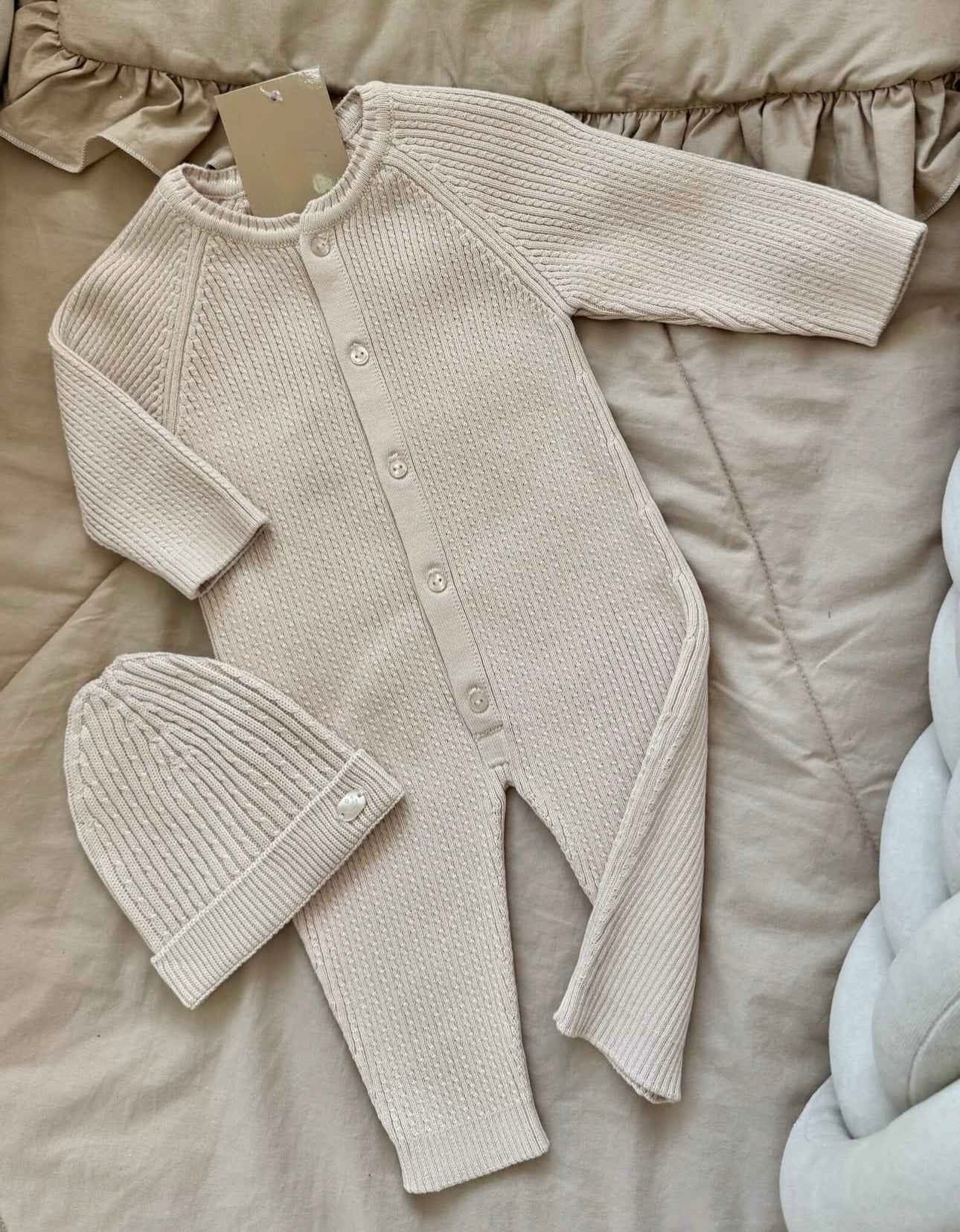 Aggiungi un tocco di dolcezza e stile al guardaroba del tuo neonato con questo completo in maglia a costine, realizzato con amore e attenzione ai dettagli!