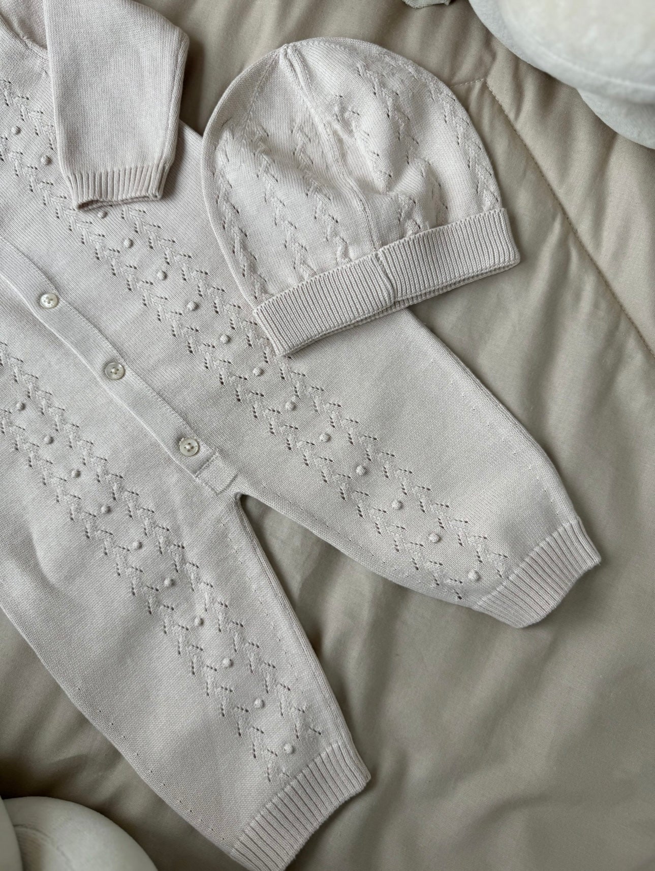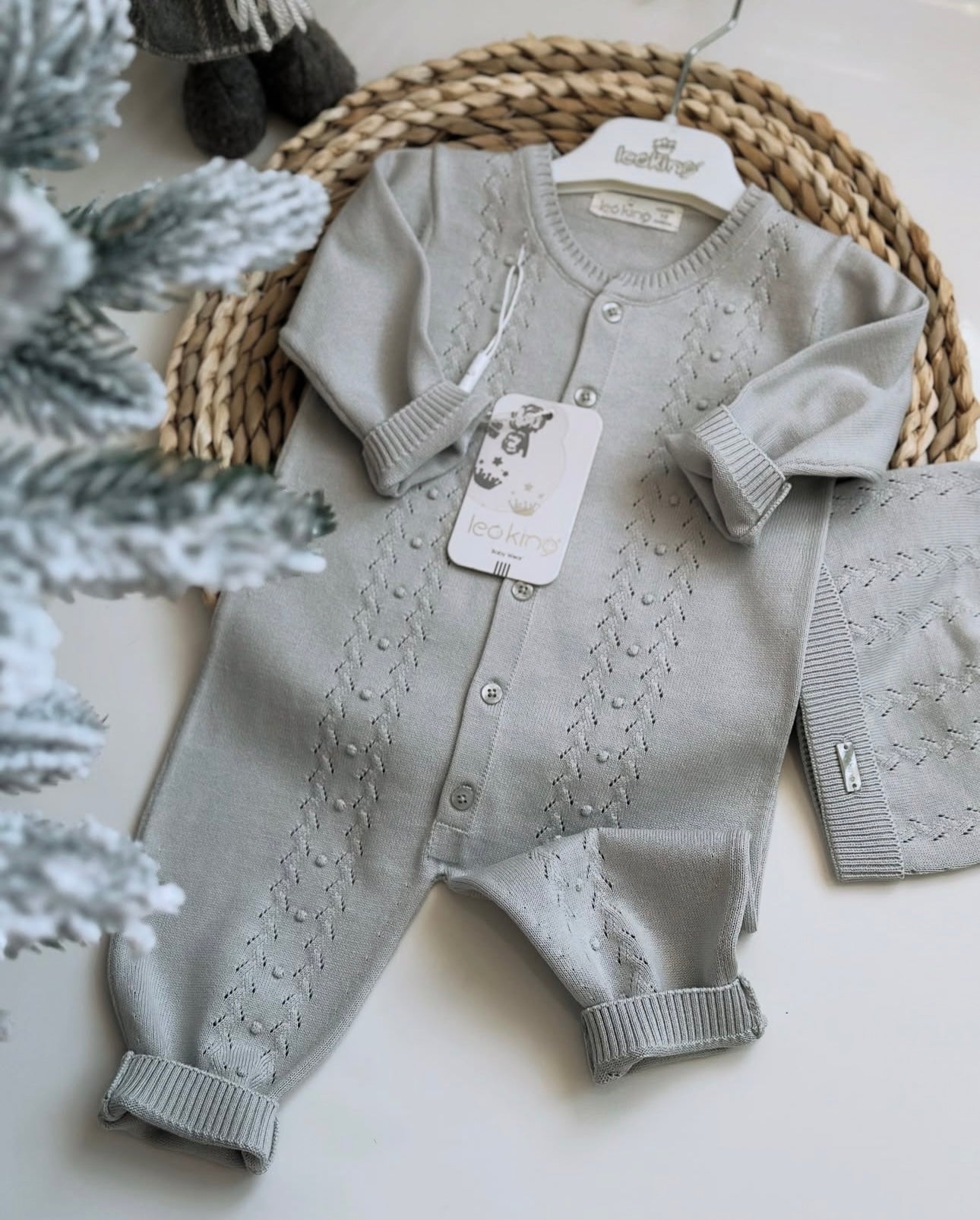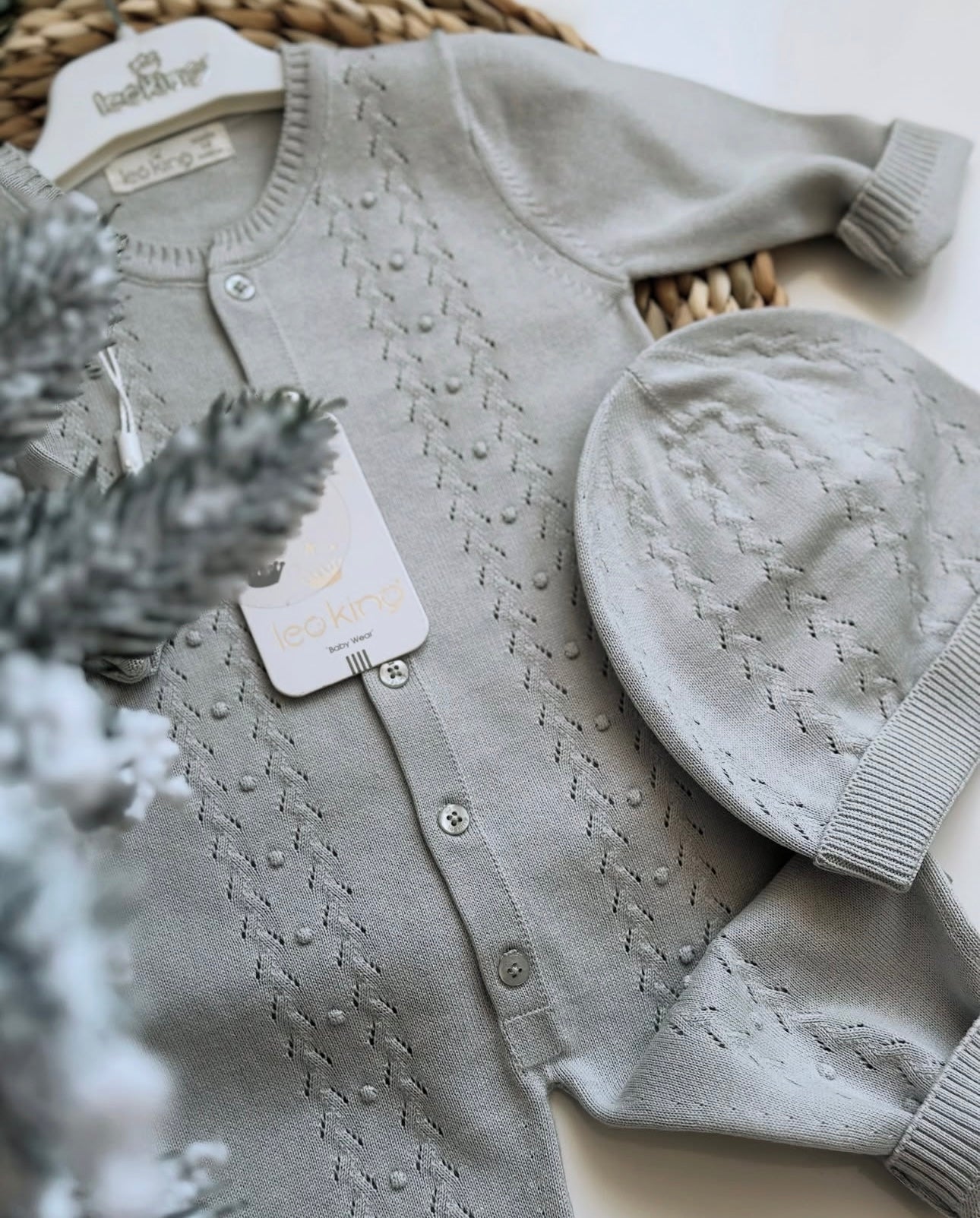Avvolgi il tuo bambino in un abbraccio di comfort e raffinatezza con questo delizioso set in maglia, composto da una tutina intera e una cuffietta abbinata. Realizzato in tessuto morbido e traspirante, è perfetto per le giornate più fresche, garantendo calore senza rinunciare allo stile.