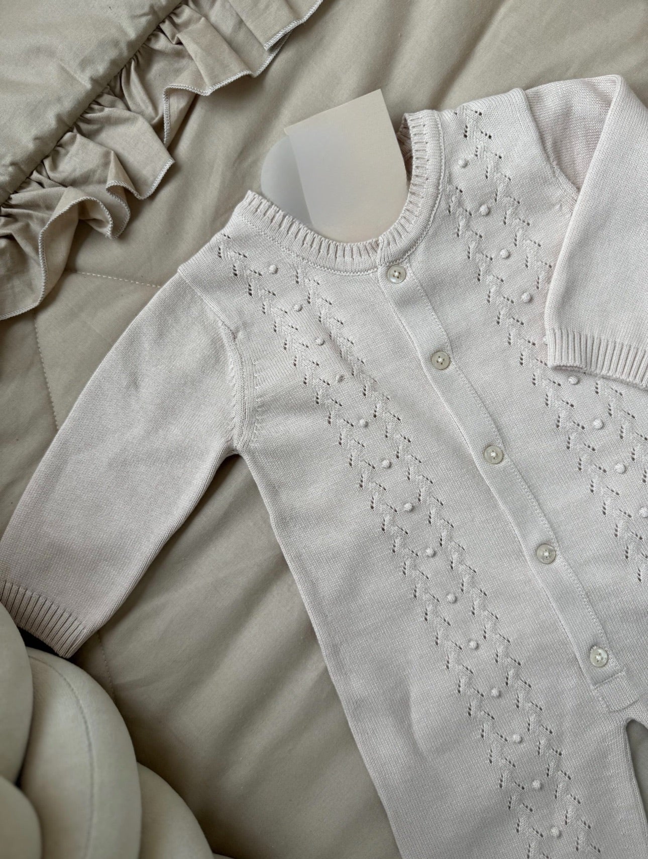 La lavorazione intrecciata e i dettagli in maglia donano un tocco classico e senza tempo, mentre la chiusura con bottoni rende il cambio pratico e veloce.