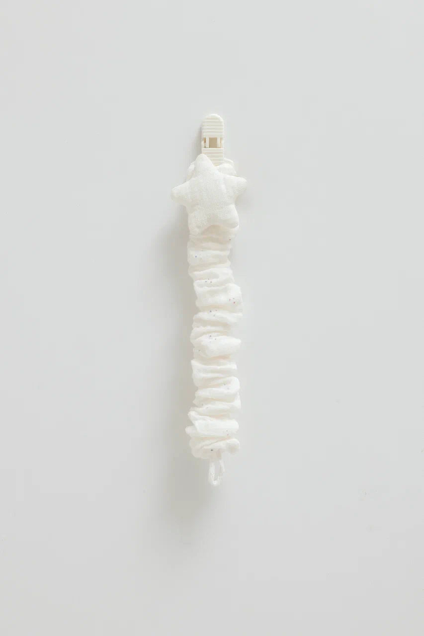 Un accessorio dolce, pratico ed elegante pensato per accompagnare il tuo bambino nei suoi primi mesi. Il portaciuccio elastico con cuore o stella permette di tenere sempre il ciuccio a portata di mano evitando che cada o si perda.