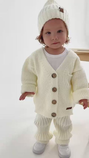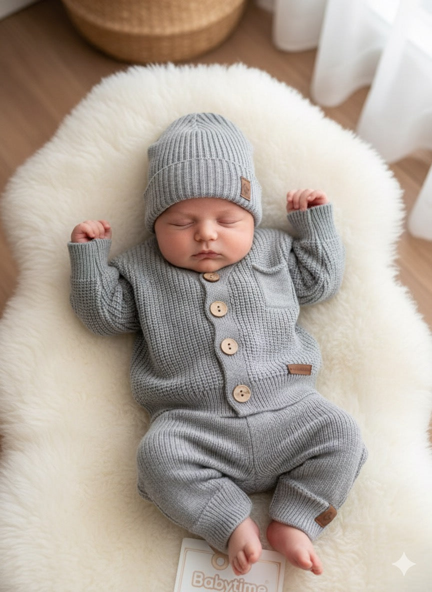 Il set è composto da tre pezzi coordinati — maglioncino, pantaloni e cappellino — tutti realizzati in un morbido tessuto a maglia, perfetto per un look elegante, naturale e confortevole.