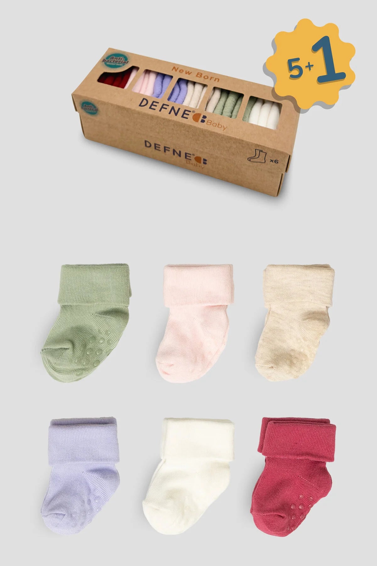 Set di 6 paia di calzini per neonato studiati per offrire comfort, morbidezza e una vestibilità delicata fin dai primi mesi. Realizzati in tessuto soffice e traspirante, sono ideali per la pelle sensibile del neonato e perfetti per l’uso quotidiano. Sulla pianta del piede sono presenti i pallini antiscivolo, ideali per i primi movimenti del neonato, offrono maggiore stabilità e sicurezza durante il gattonamento e i primi tentativi di stare in piedi.