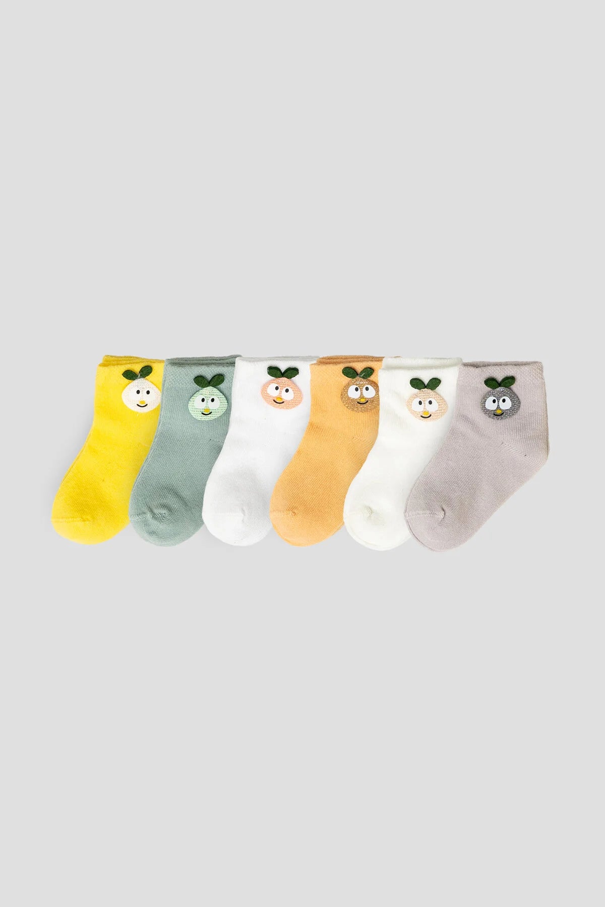 Set di 6 paia di calzini decorati sulla parte frontale con un ricamo di un frutto stilizzato con occhietti e una fogliolina verde in cima, che gli dà un aspetto dolce e giocoso.