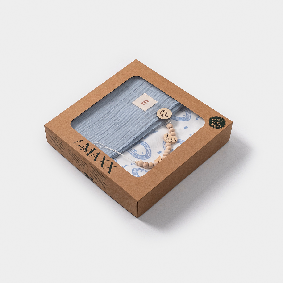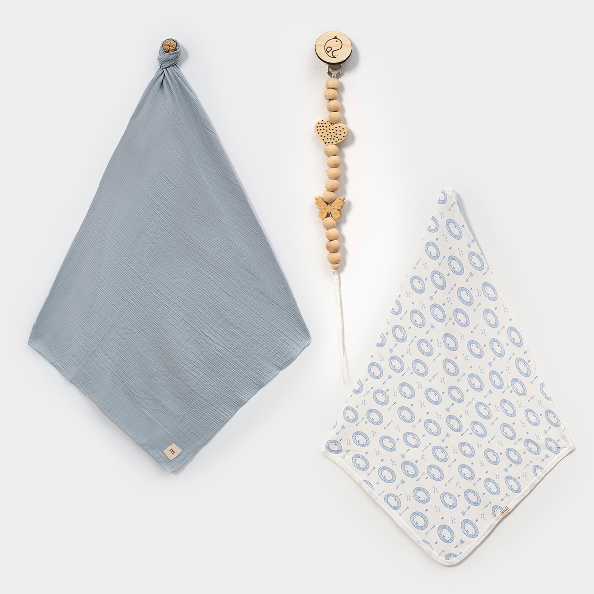 Raffinato set nascita per neonato composto da due coperte in mussola di cotone e un portaciuccio in legno naturale.