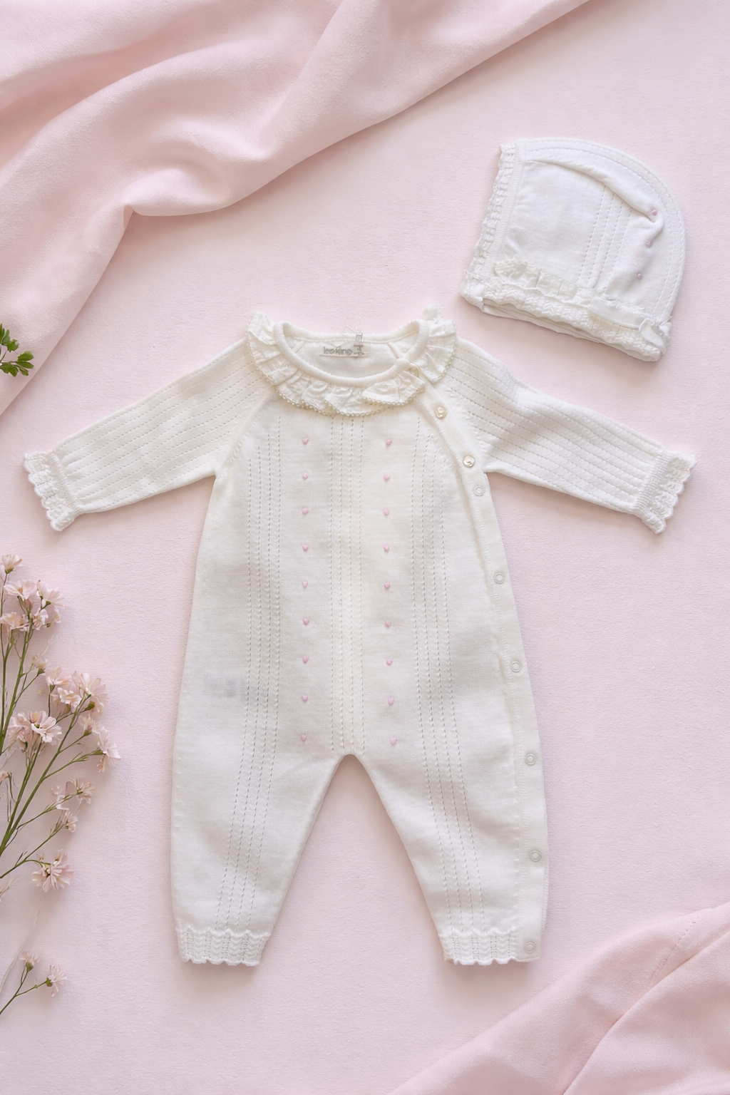 • La Cuffia In coordinato con la tutina, incornicia il viso ed è arricchito da un volant plissettato che riprende il motivo del colletto, aggiungendo un tocco di dolcezza d'ispirazione vintage.