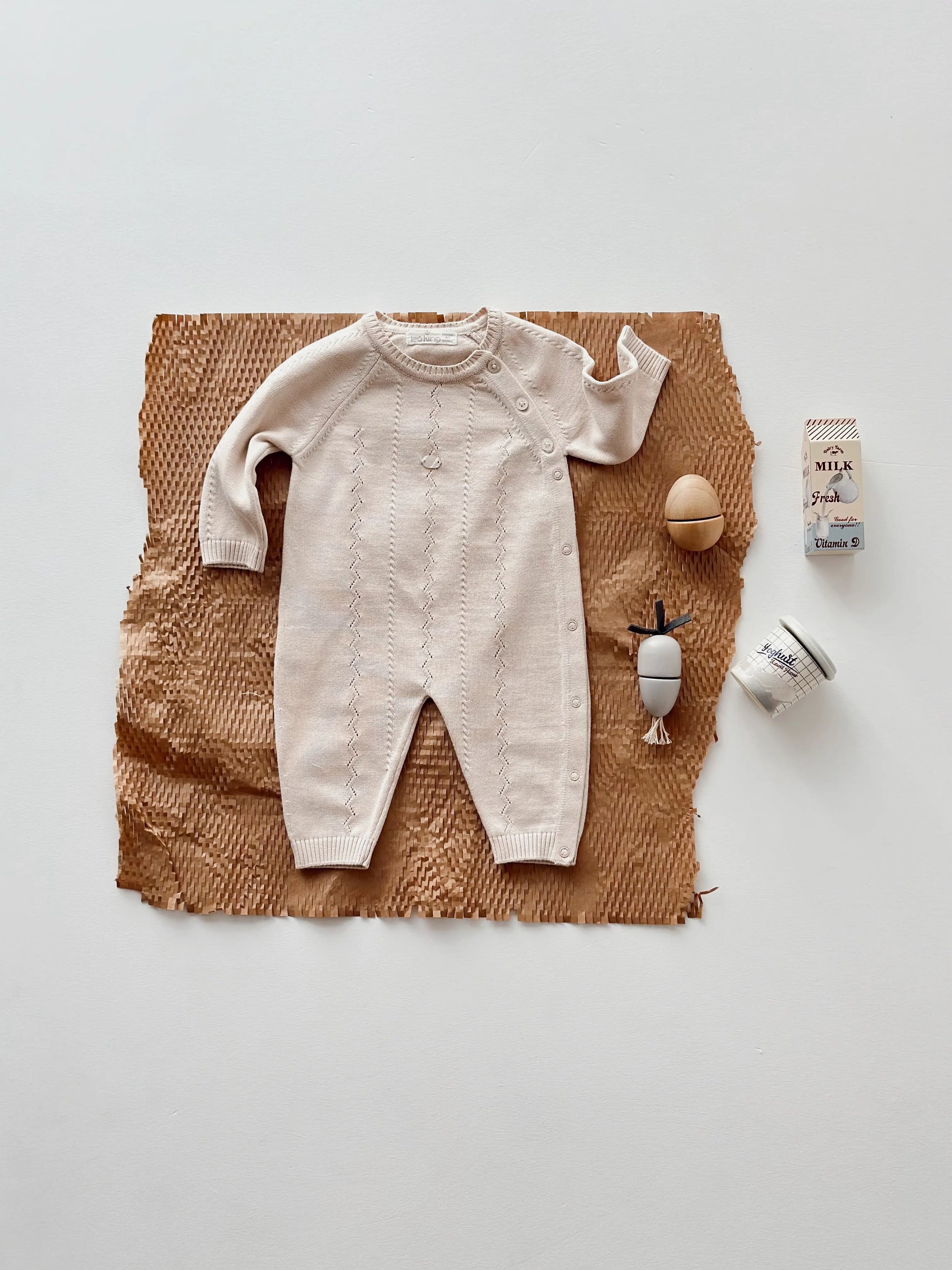 Avvolgi il tuo piccolo nel comfort e nell’eleganza con questa deliziosa tutina in maglia, realizzata in morbido cotone beige e bianco. Il design presenta un motivo a maglia decorativa a treccia sottile lungo la parte frontale, che dona un tocco raffinato e senza tempo.