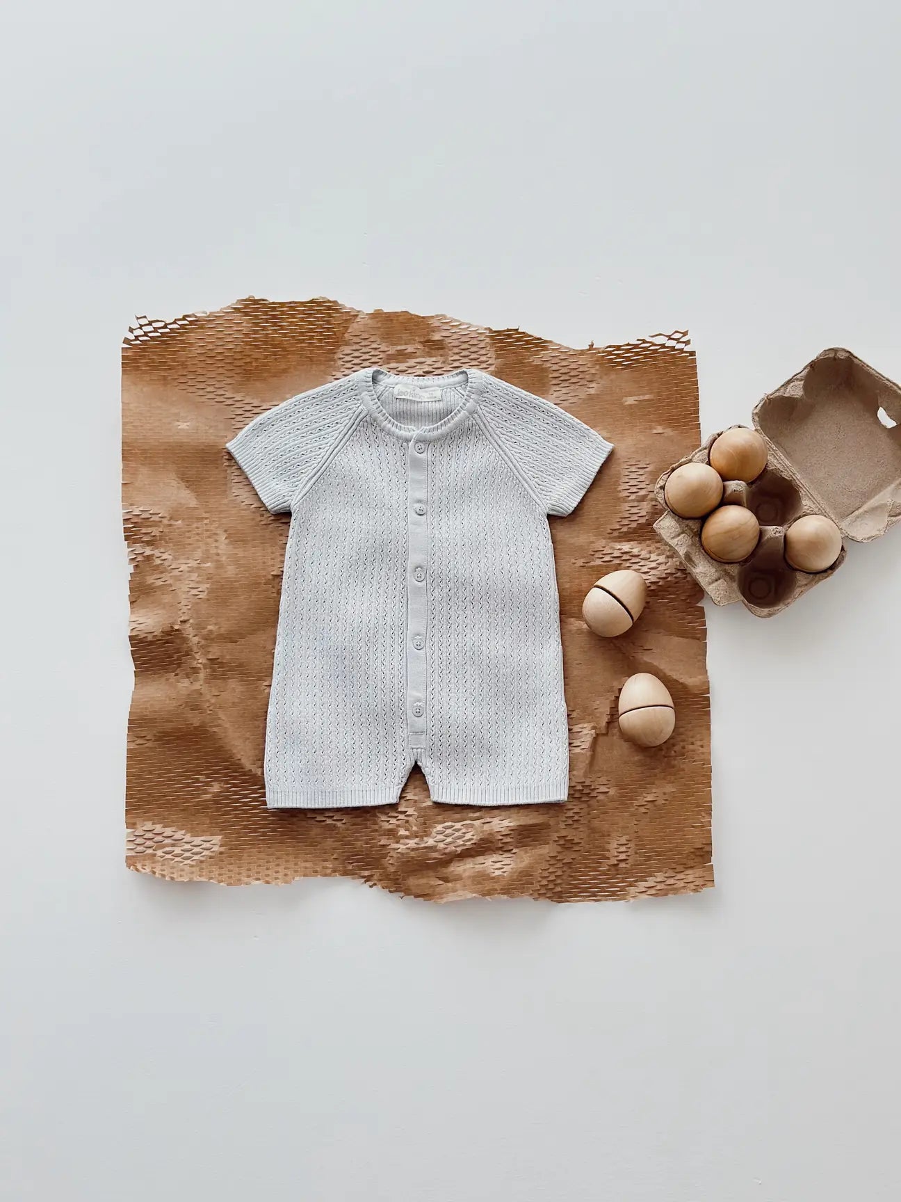 Tutina estiva in maglia per neonato, colore grigio chiaro e bianco