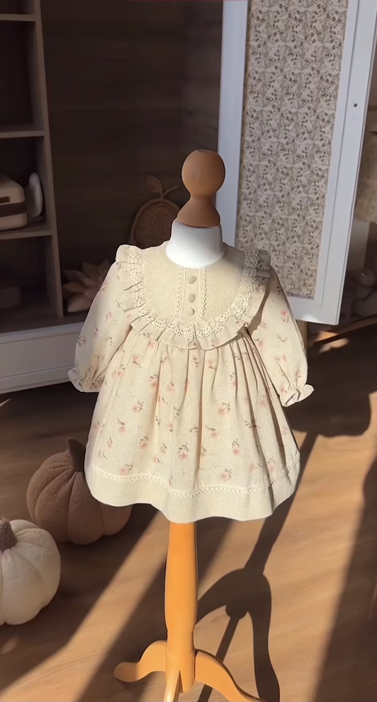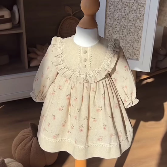 Elegante e delicato abito da bambina realizzato in morbido tessuto color crema con micro fantasia floreale nei toni del rosa cipria. Il modello presenta maniche lunghe con arricciature al polso, corpino arricchito da una balza con inserti in pizzo e bottoncini decorativi sul davanti. La gonna ampia e leggermente arricciata garantisce comfort e libertà di movimento.