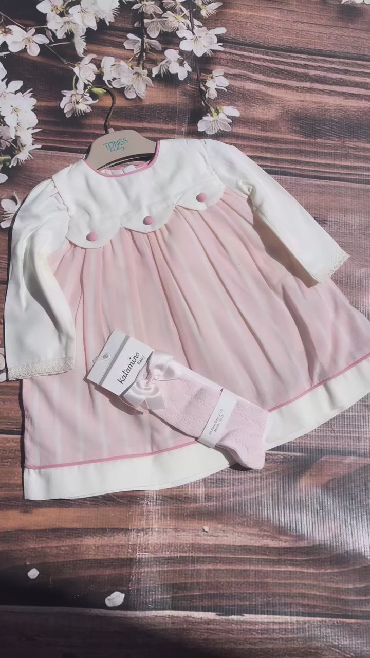 Questo abito delicato ed elegante, presenta una sovragonna in tulle rigato rosa cipria che dona leggerezza e movimento, mantenendo il massimo comfort sulla pelle delicata della bambina.