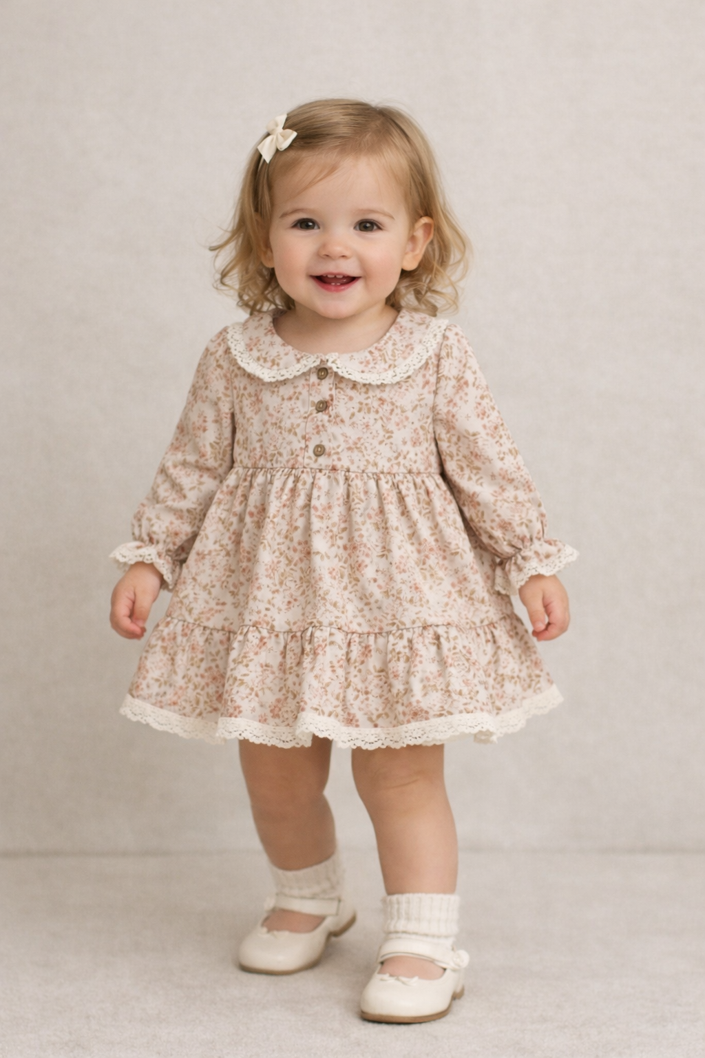 Romantico abito a maniche lunghe per bambina, realizzato in morbido tessuto di cotone con delicata stampa floreale nei toni caldi del beige, rosa e giallo. Il modello presenta:
